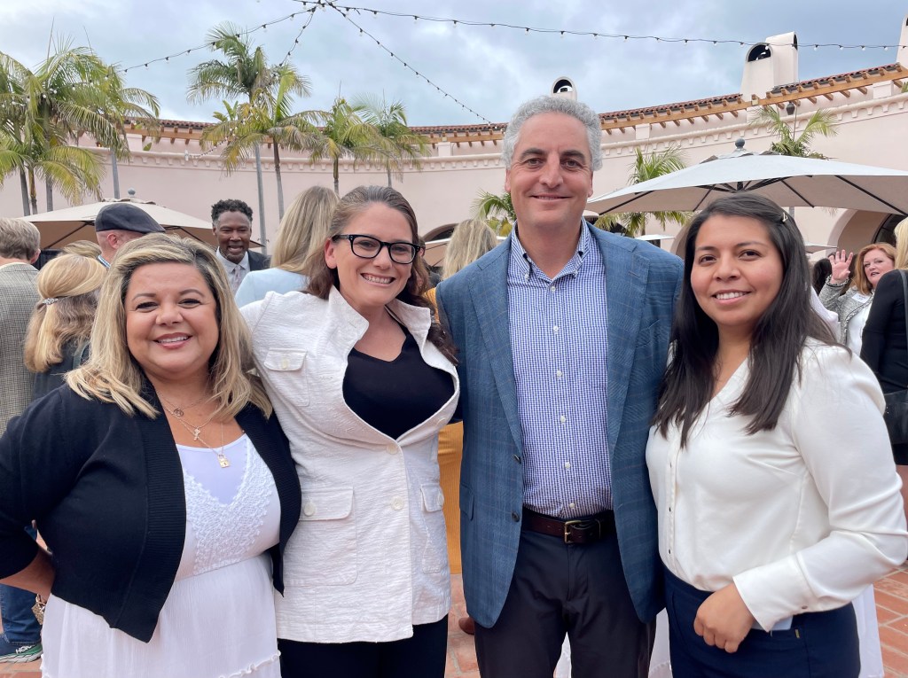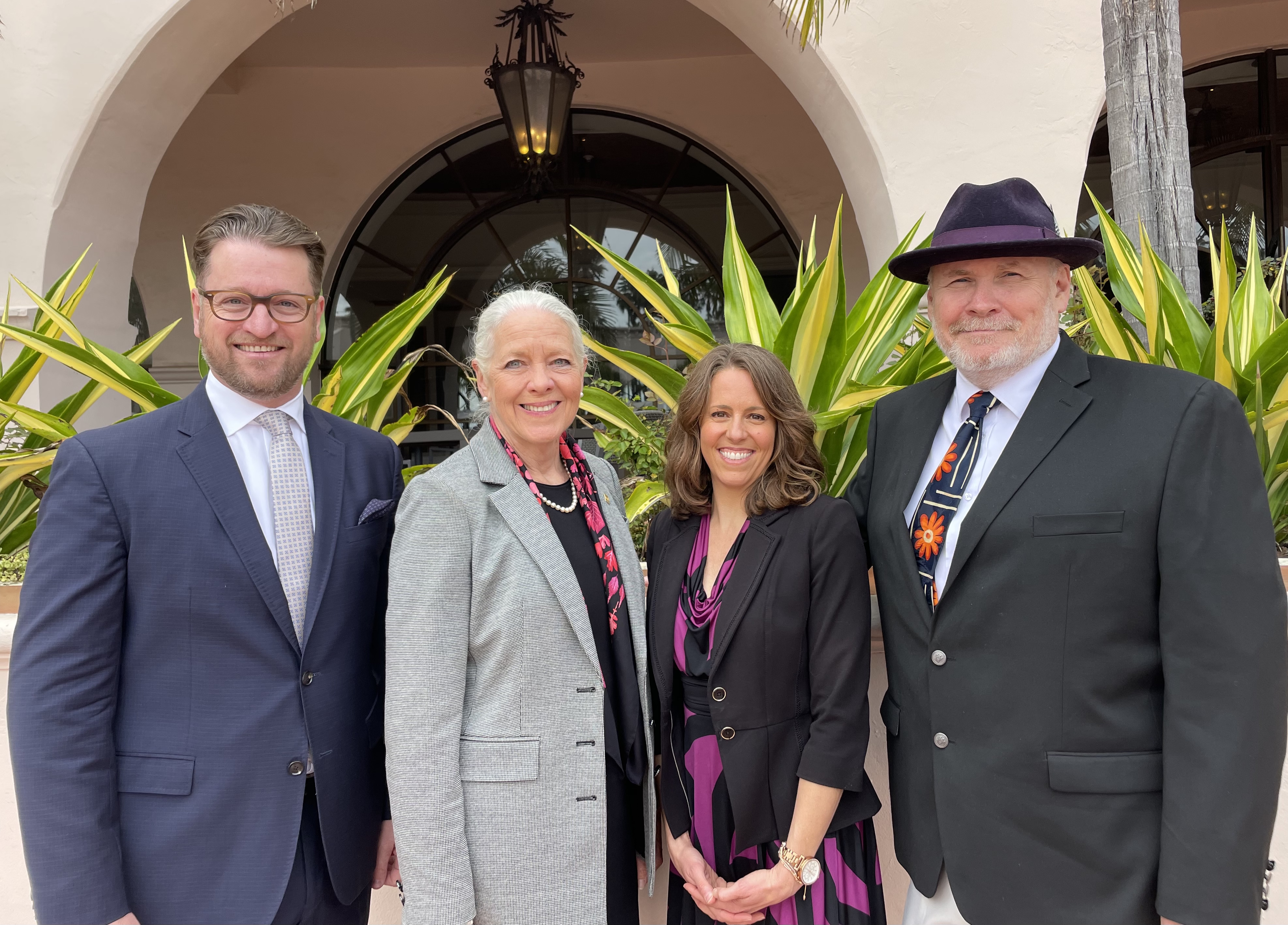 Scholarship Foundation Board Chair Matt Rowe, Event Co-Chair and Co-Host Janet Garufis, Event Co-Chair and Co-Host Kirsten McLaughlin, and Honoree Foodbank of SB County CEO Erik Talkin | Credit: Gail Arnold