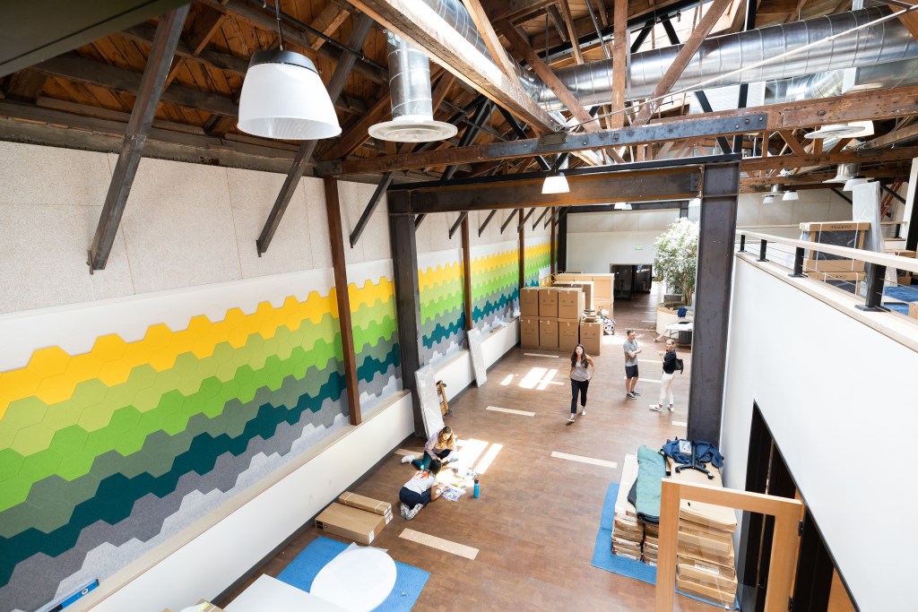 Those panels will feature storyboards illustrating the organization’s history. Along with other building materials, they are designed to soften the sound of overlapping conversations and were sustainably crafted. Each tile contains the equivalent of four recycled water bottles.