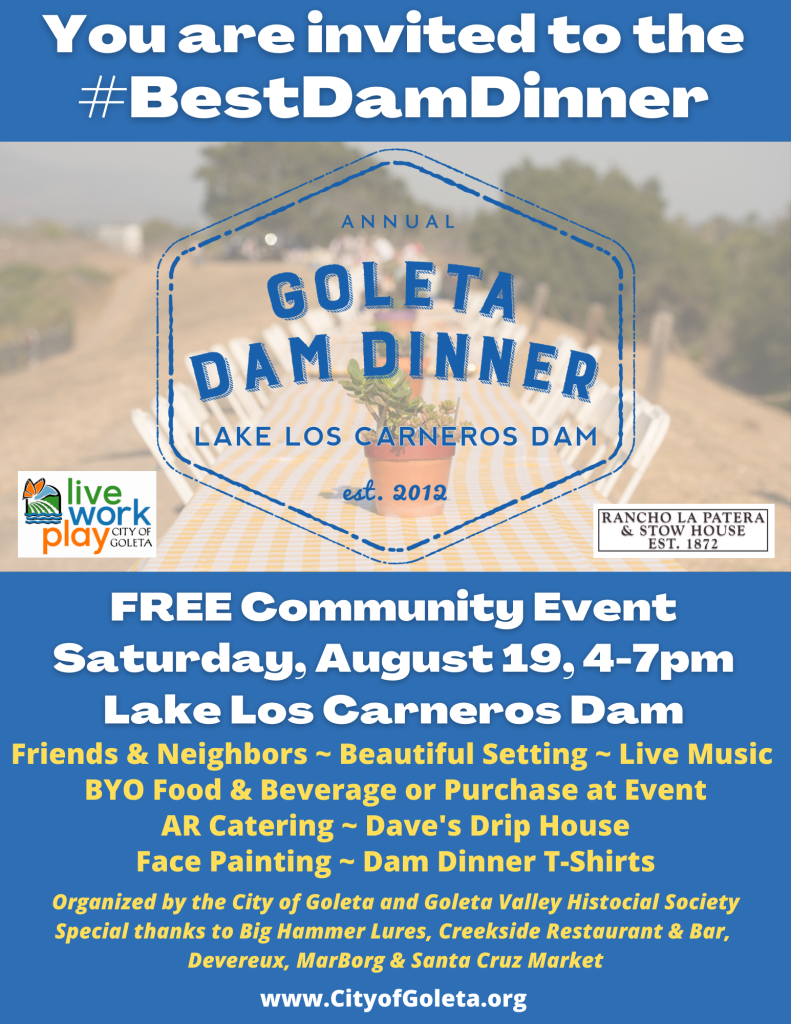 GOLETA, CA, July 5, 2023 – A favorite local event, the Goleta Dam Dinner is set for Saturday, August 19, 2023. Its popularity has grown over the years, so we are adding an extra hour of fun! Bring your friends and family and join us at the scenic Lake Los Carneros Dam from 4:00 p.m. to 7:00 p.m. Watch this video invite in English (https://youtu.be/0ERI5zReyLU) and Spanish (https://youtu.be/0q5zcYgOJxU) for more info.
