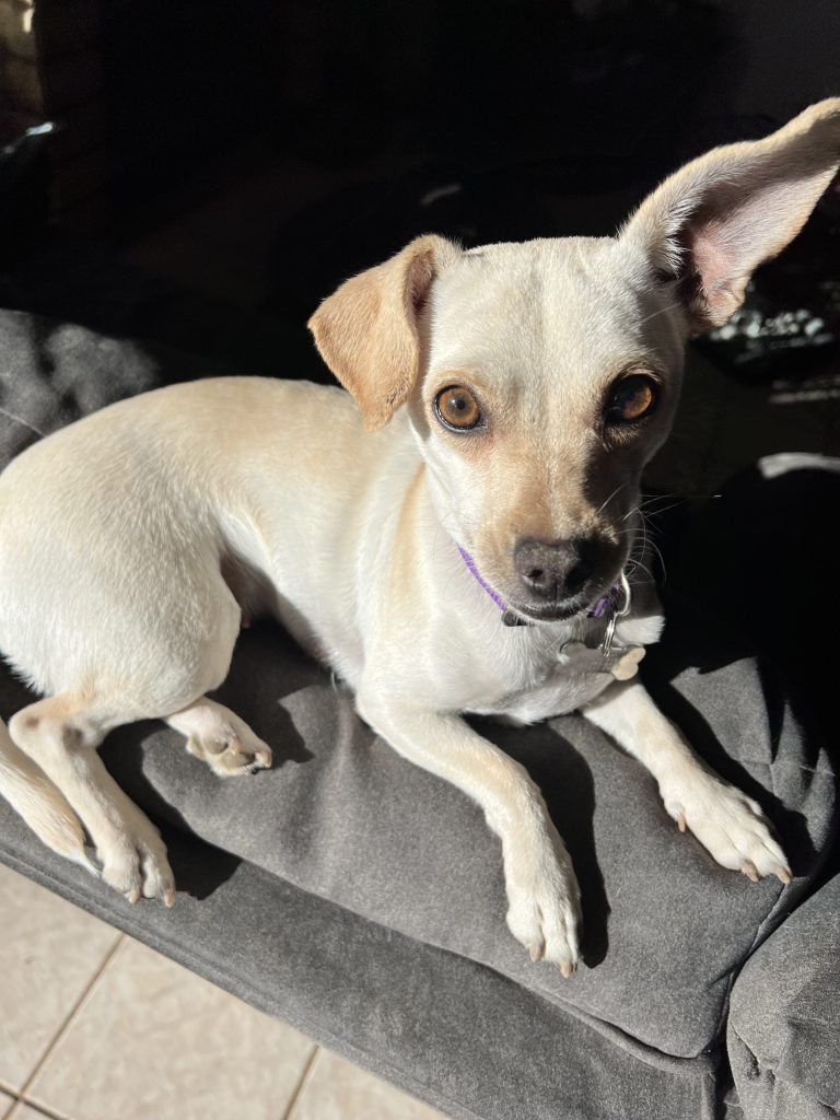 Bernie is a beautiful white and fawn colored Chihuahua mix, with soulful amber eyes. At just 13 pounds, she is small enough to take everywhere. This 2 year old beauty was almost feral when she came to the rescue. Although she is still shy when meeting new people, if introduced slowly she is a real gem. She also gets along with other dogs as long as she meets them one on one. Due to the trauma she endured during her time as a street dog, meeting many dogs at once scares her. She is the most loving little girl you will ever meet. She sounds like a dove when she talks, looks like a little goat when she runs and fly’s like a dear when she jumps. She just needs someone who will show her patience and love. She has been in rescue for almost a year, she’s ready to find her fur-ever family.