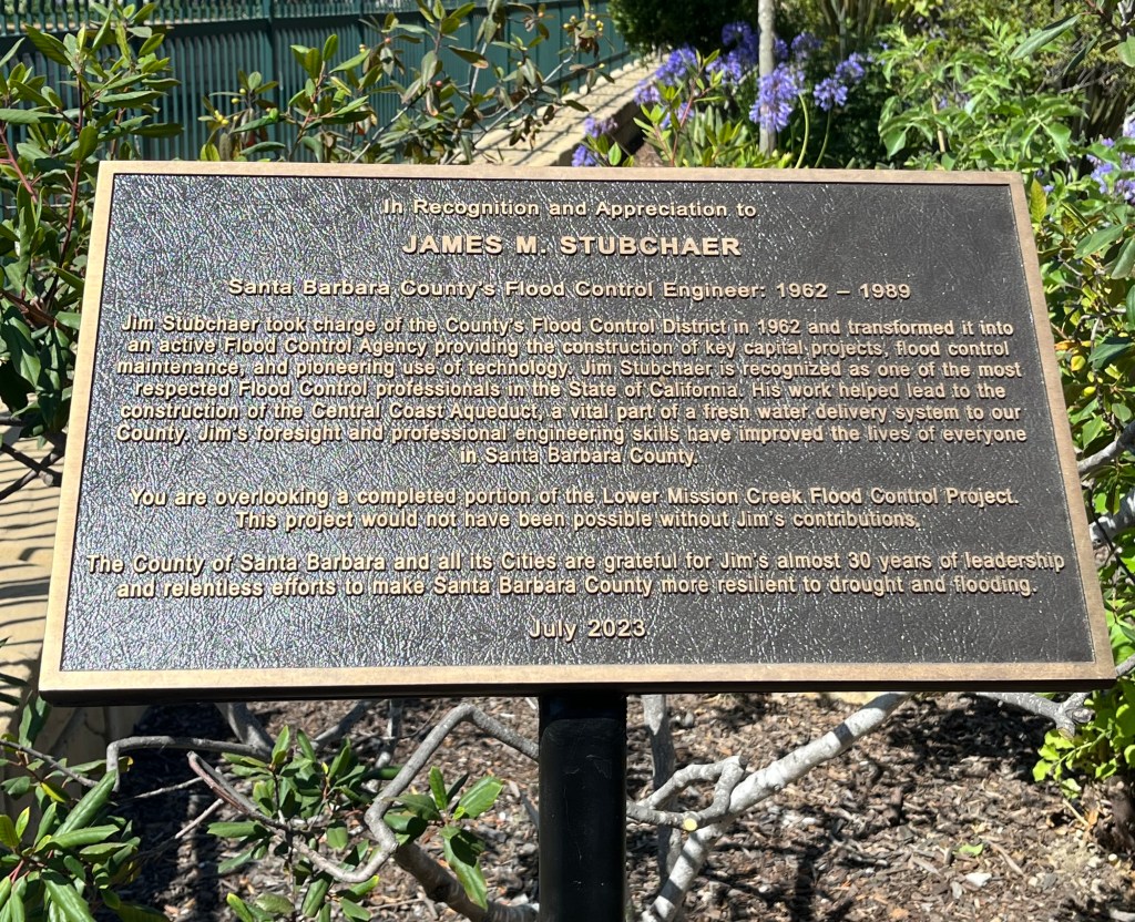 During his years as flood control manager for the County of Santa Barbara, Jim Stubchaer built 13 debris basins on the South Coast and participated in the response to floods and debris flows between 1962 and 1989. To honor Stubchaer’s legacy — unquestionable but mostly overlooked in everyday life — his colleagues, friends, family, and county officials gathered at the foot of Mission Creek on Monday morning to unveil a plaque that described his achievements.
