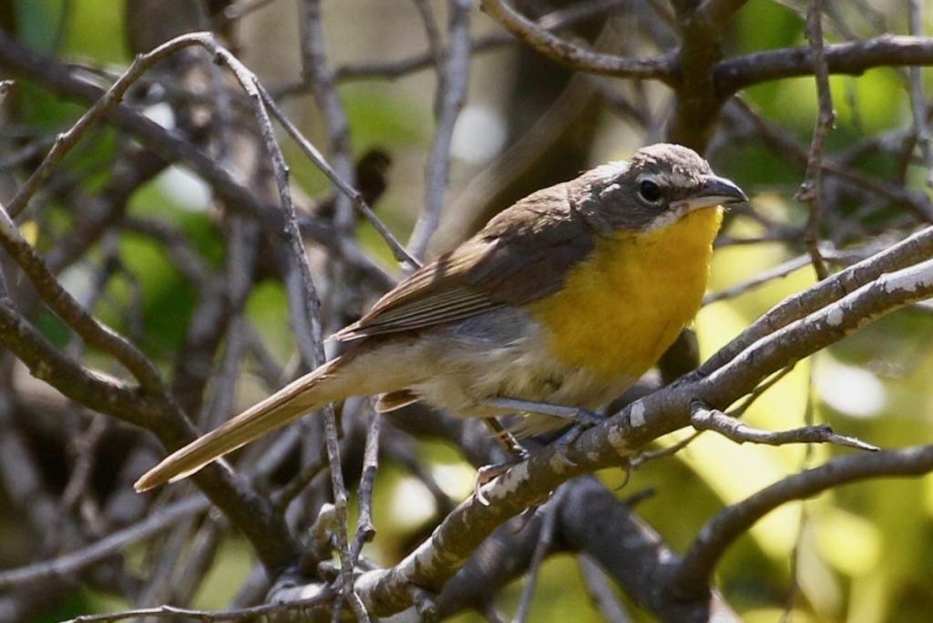 The chat has long been a taxonomists’ mystery. For many years it was regarded as a type of warbler. Its bright yellow chest and olive back certainly give it a warbler-like appearance, but it is considerably larger than any warbler, approaching a thrush in size. The song is also most decidedly un-warbler-like. Most North American Warblers have simple repetitive songs, but not so the chat! The Cornell Lab describes it: “the chat offers a cascade of song in the spring, when males deliver streams of whistles, cackles, chuckles, and gurgles with the fluidity of improvisational jazz.”