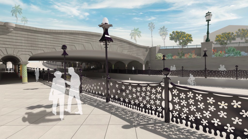 The undercrossing will have a new look, with brightly colored tiles adorning the columns along the walkway, designed by renowned Santa Barbara architect Jeff Shelton, as well as new light posts and custom ironwork railings — with flower-shaped cutouts along the sides — which were designed by Jeff and will be made by his brother David.