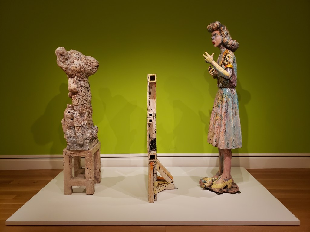 In the large centerpiece of the exhibition, Frey’s wild and whimsical “Homage to Dubuffet” (1977–80), a larger-and-funnier-than-life coupling of a tall, fauvist-colored woman facing off with a mangled beast of the sort that “Art Brut” master Jean Dubuffet might have created. It’s an art historical in-joke, in which beauty meets beast and eras and attitudes do a wobbly dance.