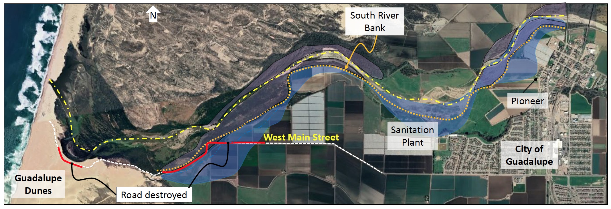 The historic amount of rainfall sent a tremendous load of debris and silt down the river channel, which broke out of its bounds in three places, flooding a part of the City of Guadalupe, its sewage treatment plant, and the county’s main road to the Guadalupe Dunes. As long as no water is flowing, Fish & Wildlife will allow debris removal and about one-third of the vegetation per mile, McGolpin said.