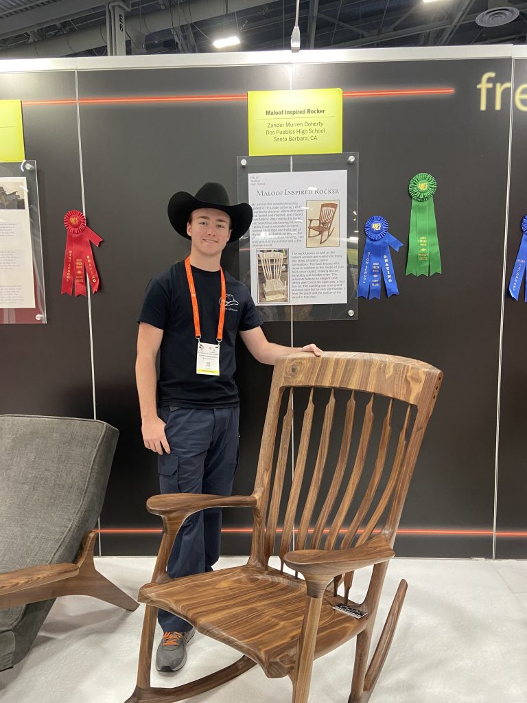 Dos Pueblos High School student Zander Doherty, age 17, has earned national recognition for his woodworking skills and is the first person in Santa Barbara history to qualify and compete in Freshwood at AWFS (Association of Woodworkers & Furnishings Suppliers). At the national competition, which took place at the Las Vegas Convention Center from July 25-28, Doherty’s rocking chair took first place in the seating category and was also the recipient of the highly competitive “People’s Choice Award.”