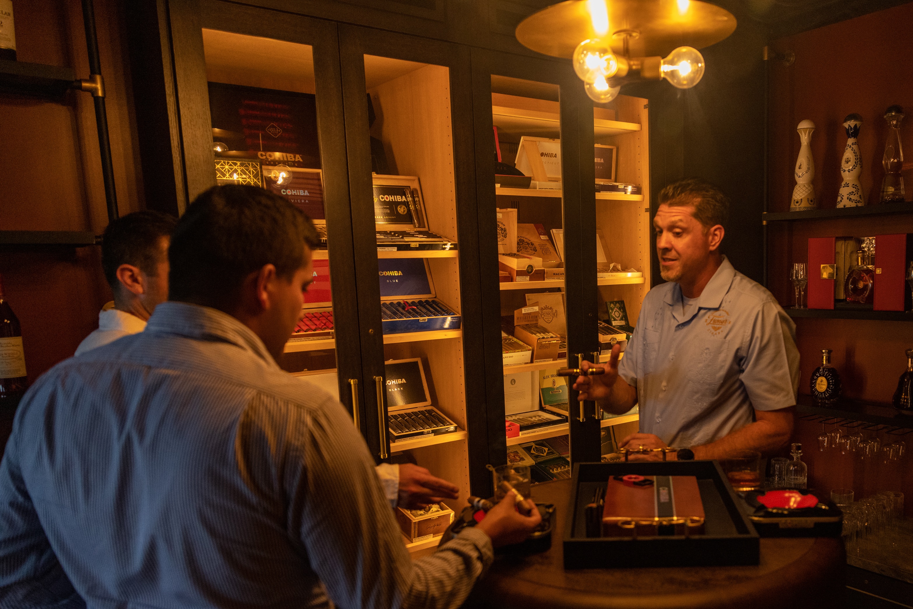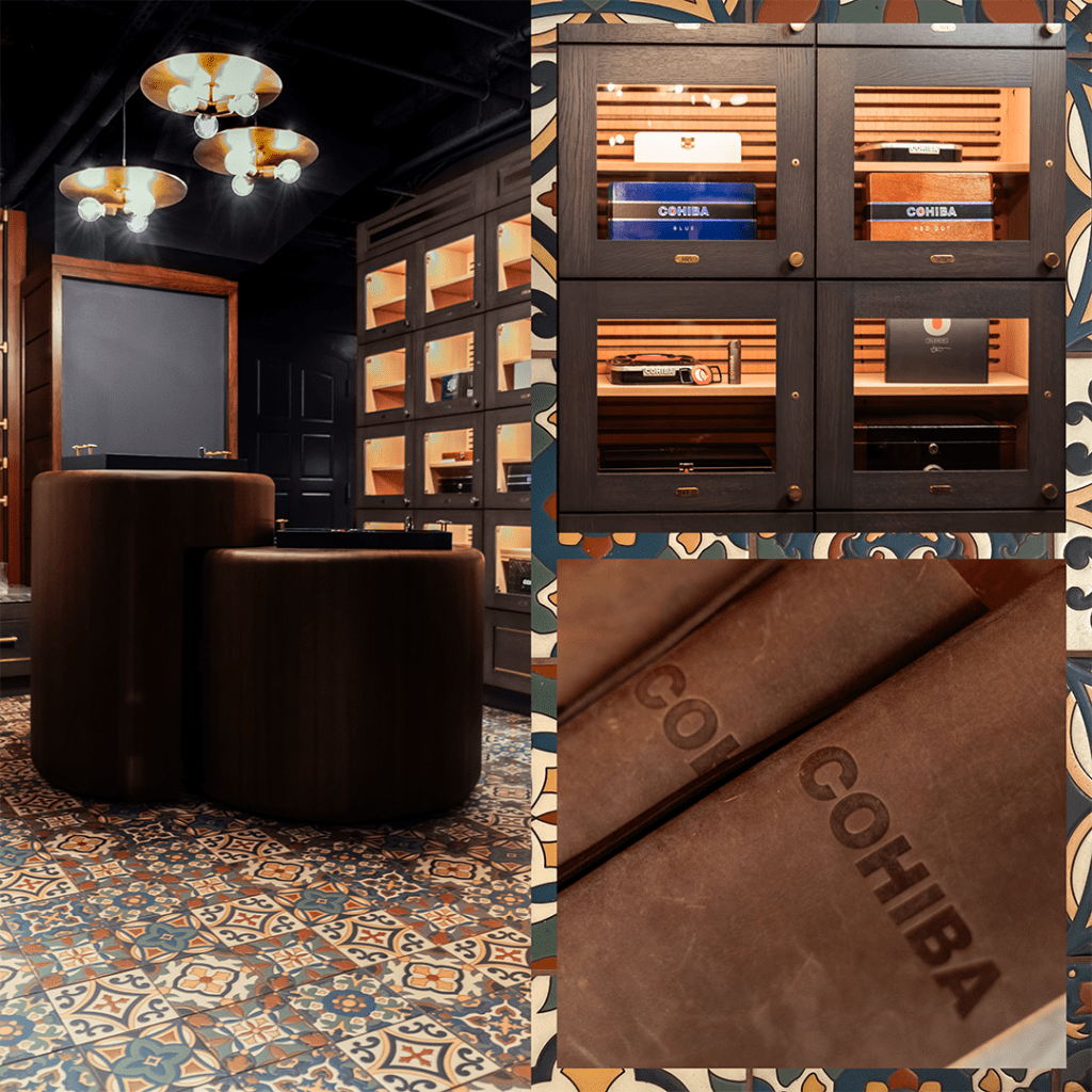As one might imagine, the first permanent Cohiba Cigar Lounge in the U.S. does have a stunning cedar-lined, walk-in humidor, dominated by Cohiba’s famous logo — the most recognizable cigar name in the world, it was once Fidel Castro’s private label brand and in the same kind of luxury category as Dom Pérignon Champagne and Rolls Royce — and an assortment of selections from the storied brand such as the Red Dot (Dominican Republic), Cohiba Blue (Honduras), and the Royale (Nicaragua).