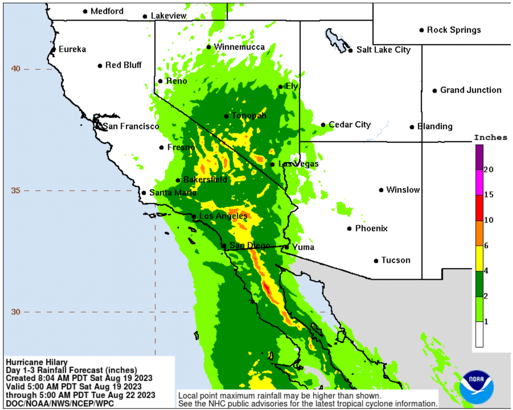 The greatest concern is for the Antelope Valley and the desert communities in Hilary’s path. A storm warning is in place for Los Angeles and Ventura counties for the flooding expected from as much as 10 inches as the very large storm system passes through.