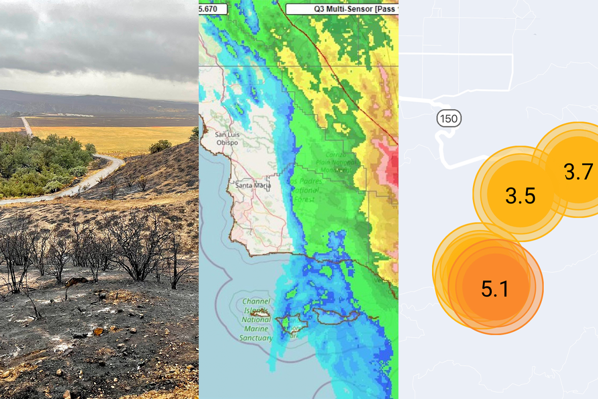 Not so for two North County fires on Saturday or the earthquakes that shook Ventura. First, around 12:30 p.m., the Hapgood Fire near Buellton consumed about an acre and was nearly surrounded by a bulldozer line when the call came for a large fire near New Cuyama. Burning across the hilly terrain of State Route 166, the Plant Fire grew from 300 to nearly 5,500 acres as it was driven by erratic winds from the approaching storm. Residents were evacuated, and SR 166 was shut down overnight before firefighters gained control of the fire with the help of the rain, allowing residents to return to their homes late Sunday afternoon. About 636 personnel were assigned to ground crews, 19 hand crews, and 58 engine crews. The fire was at 60 percent contained on Monday.