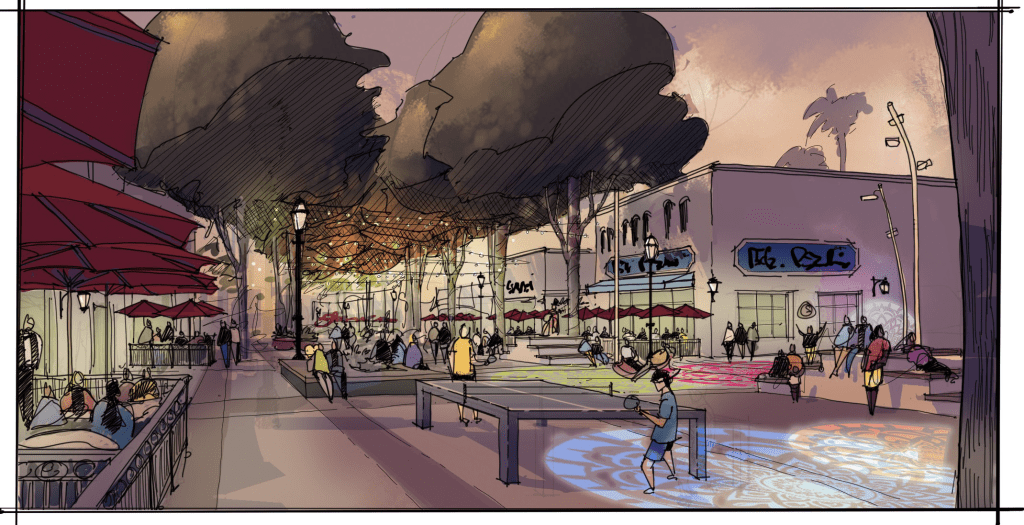Planners also floated a “what if” scenario for the city, proposing that the City Council rethink its patio seating policies and consider adapting the regulations to expand parklets into the street. In the renderings, parklets are doubled from six feet wide to 12, and pushed out of walkways into the center of the street.