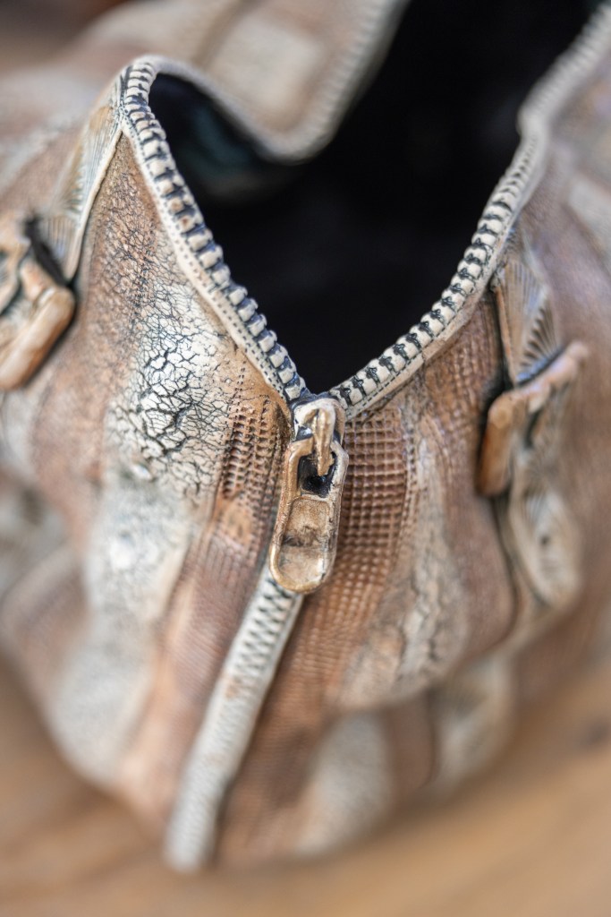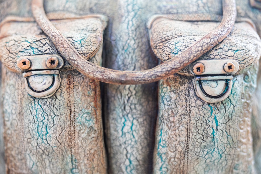 An urge to break from convention is present in much of Horowitz’s work. His luggage series perfectly demonstrates his desire to resist conforming to expectations of form and material, creating a work of pottery that surprises and deceives. “I saw this bag sitting on a counter,” he told me, showing me a picture of a perfectly ordinary leather bag. “Look at the way the fabric just naturally falls and just makes you want to pick it up, or touch it, or get closer to it.” Upon closer inspection, however, these moments of sculptural beauty vanish in the flexibility of leather. By hand-building the bags with detailed surface texture, Horowitz preserves the transient beauty of leather in stone, a process he deems “interpreting” rather than sculpting. This interpretive illusion is only broken by its own captivation. “When you clink it with your finger?” said Horowitz, “‘Oh, this is made out of ceramic.’”