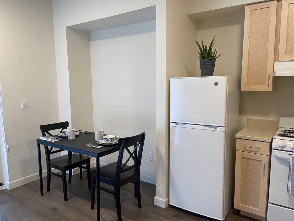 That final push to get the units ready for move-in took even more extra work. The elevator was not quite ready in the week before the grand opening, so a dream team of volunteers lugged every piece of furniture up the stairs (units are on the second, third, and fourth floors) to make every studio “a place to call home,” Fredericks said.