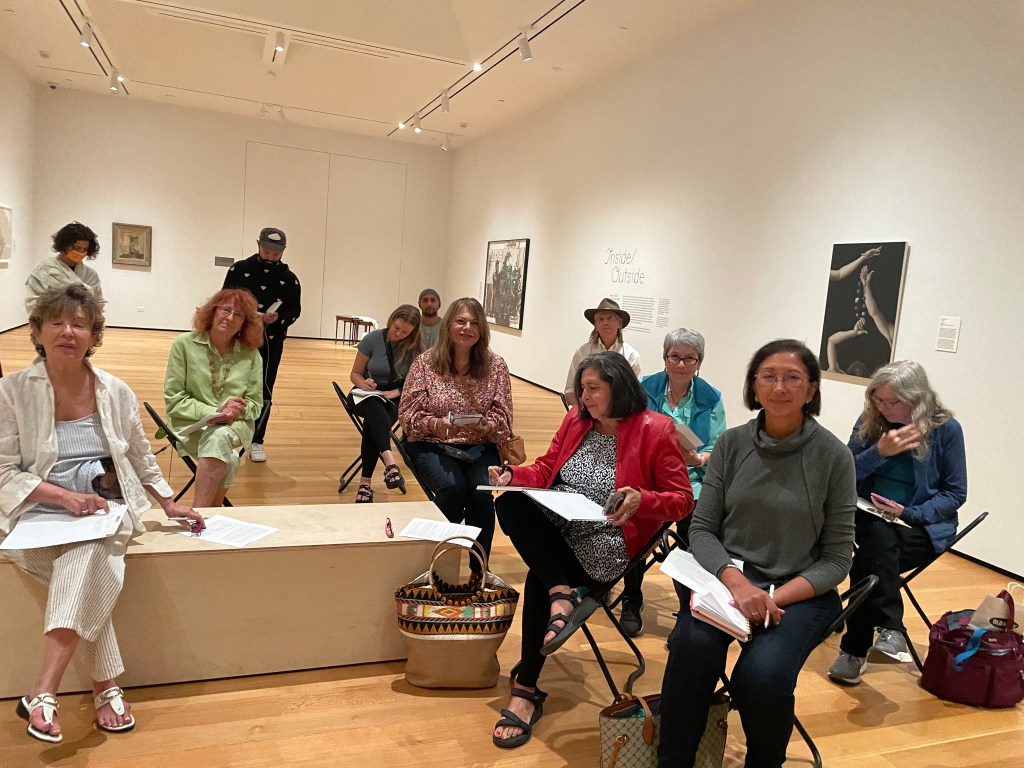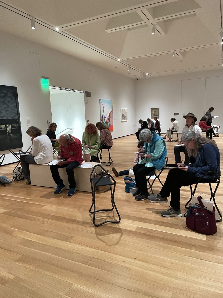 For the workshop, I chose the inside/outside gallery at the Santa Barbara Museum of Art. The collection features one of my new favorite artworks, a Keith Mayerson painting entitled: Someday we’ll find It, the Rainbow Connection, the lovers, the dreamers, and me 2023. The painting is of Kermit the Frog riding out of the swamp to Hollywood on a yellow bicycle. I can’t think of a happier image. Prior to the workshop, I stopped by the gallery to spend some time with Kermit. Everyone who sees this painting smiles. It has a happy effect on people.