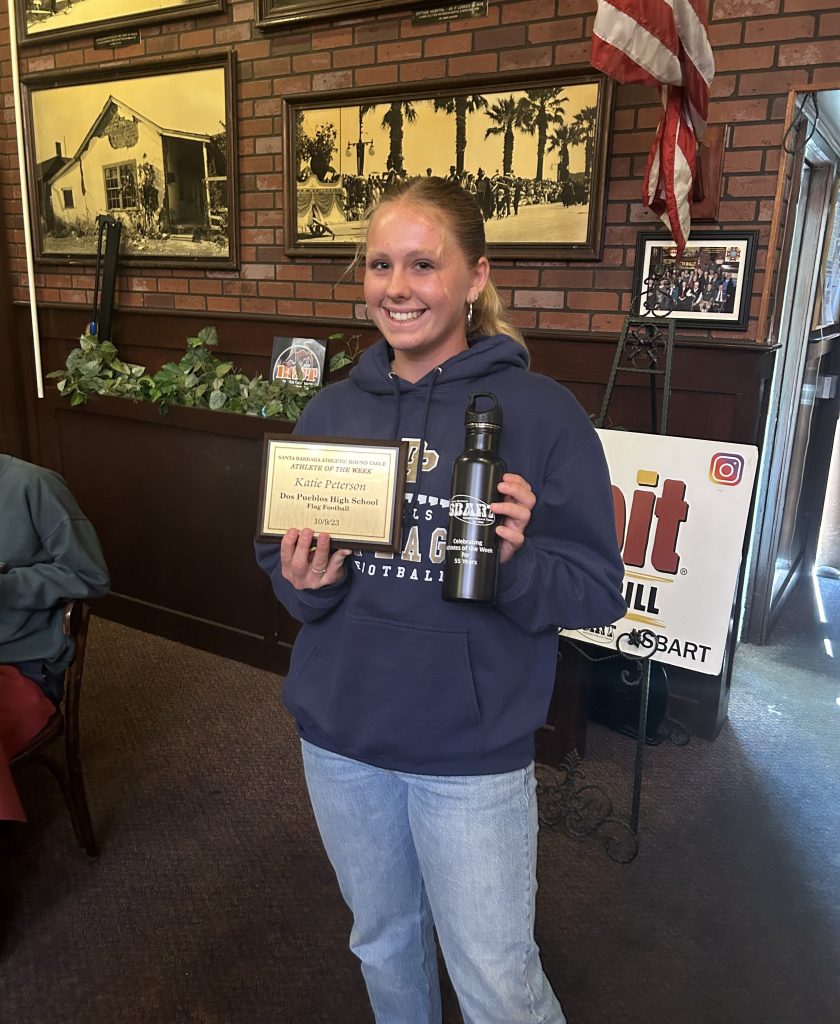 Asher Smith of Carpinteria boys’ water polo and Katie Peterson of Dos Pueblos flag football received SBART Athlete of the week awards at Monday’s press luncheon.