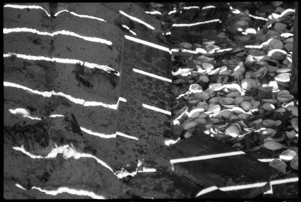 Along the path through this selection of 60 images, we catch sight and suggestion of Kelly’s artistic voice in his mainstream mode, starting with the almost calligraphic shadowy forms in the small entryway images “Stairways, St. Martin,” from 1977. The stripes against a murky dark backdrop in “Beach Cabana III, Meschers” (1950), and the linear dance of another shot from the southwestern French seaside outpost of Meschers, “Shadows on Stairs,” discernibly correlate with the visual proclivities of his studio art.