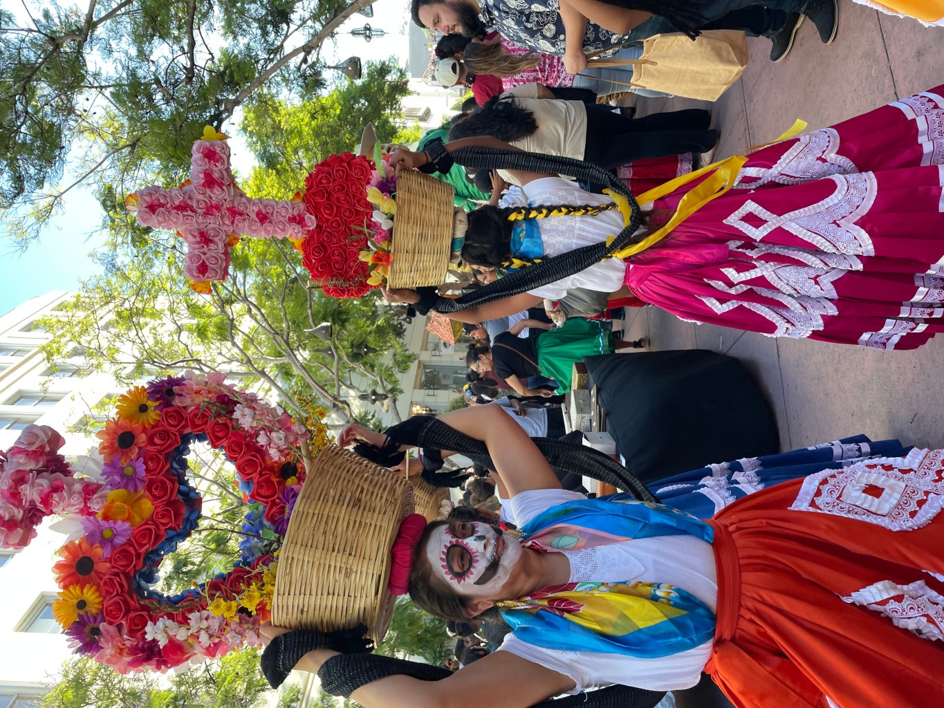 During a day-long celebration of the Day of the Dead, Santa Barbara came to life. The community celebration and Oaxacan calenda (procession with music and dancers and larger-than-life puppets) was something we had never experienced before in our town. I am very grateful to have participated in the procession and in the Santa Barbara Museum of Art’s pre-calenda activities. The Santa Barbara Museum of Art outdid itself with altars and activities for the whole family. Many people sported their flower crowns and decorated skull necklaces. The Día de los Muertos activities made for a colorful audience. While people waited in costume for the calenda, some dropped by to hear poetry and song in the galleries.