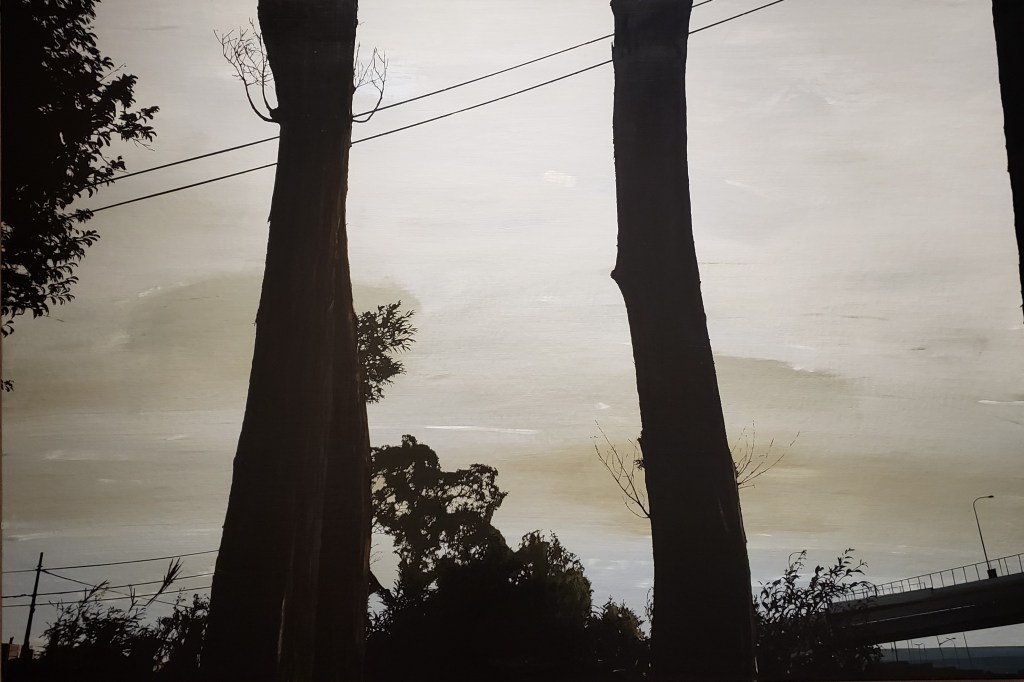 Enticement comes in surprising and presumably everyday ways in this art. The painting “Gakugaidaigaku” features two thick tree trunks as visual protagonists set against a gray-blue sky and with a tilted slip of a bridge in the lower right corner.