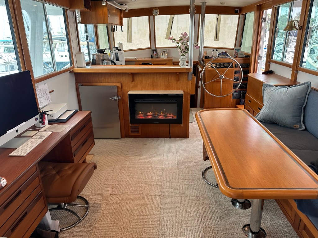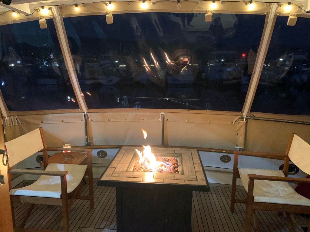 Speaking of comfort, the Summer Solstice has not one but two fireplaces. One is a fire table on the aft deck, lending ambience to this cozy gathering place, day or night. The other fireplace is an electric heater with faux flames crackling in the middle of the living room, a k a the salon.