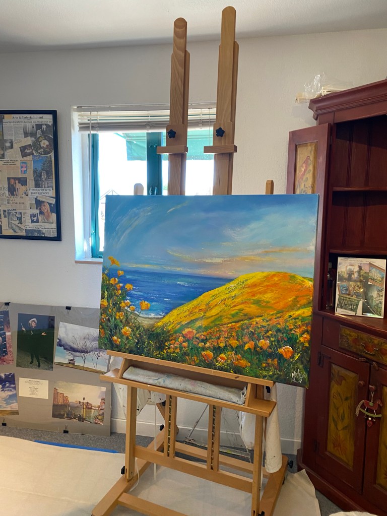 Ushering me inside, she gave me a tour around her new space — Galerie LaParlière. Some canvas works catch my eye, like her “Golden California” — a bluff covered in California poppies overlooking the Pacific Ocean. But it’s clear to me that her favorite creations live on the surfaces of furniture. “I’m a decorative artist,” she says as we admire the “The Swamp Chest” — a four-drawer emerald-green dresser covered with a painting of a swamp.
