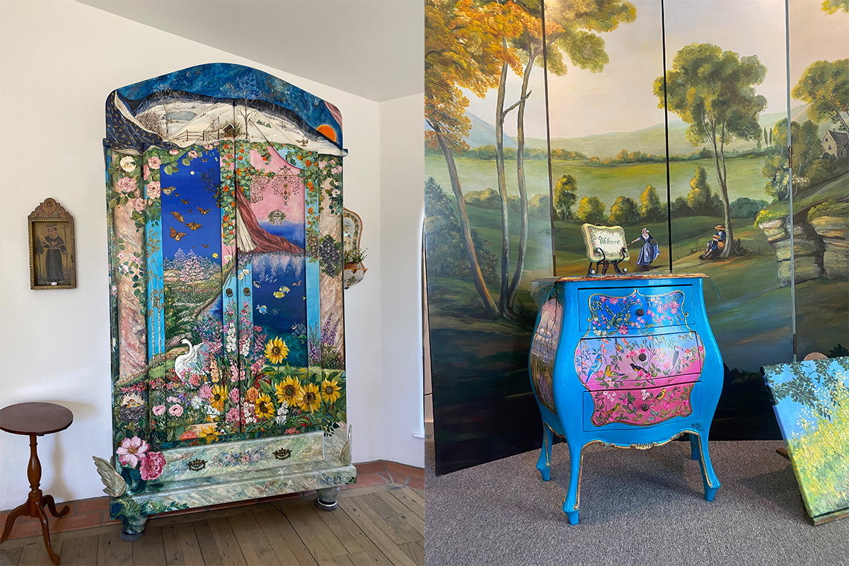 Ushering me inside, she gave me a tour around her new space — Galerie LaParlière. Some canvas works catch my eye, like her “Golden California” — a bluff covered in California poppies overlooking the Pacific Ocean. But it’s clear to me that her favorite creations live on the surfaces of furniture. “I’m a decorative artist,” she says as we admire the “The Swamp Chest” — a four-drawer emerald-green dresser covered with a painting of a swamp.