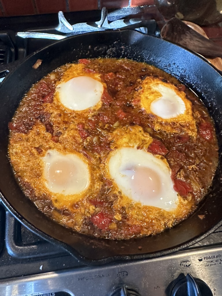I was also proud of my first stab at shakshuka, the baked tomato stew-with-egg dish of Maghrebi/North African origin. Using peppers and tomatoes that we’d collected the day before during a work party at Rancho San Julian, I put a slightly Mexican spin on the warm breakfast by serving it with cheese-crusted tortillas. The whole family dug that one.