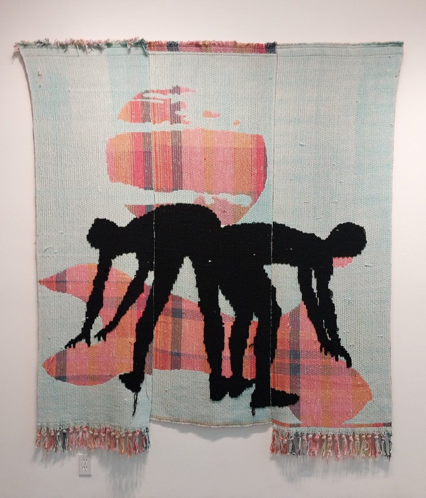 The one textile art piece in the gallery, Diedrick Brackens’s “Stealing dark from the sky” (from intricately woven cotton and acrylic yarn) hints at a native mythological narrative tucked into an image of silhouetted figures and a pastel pattern backdrop.