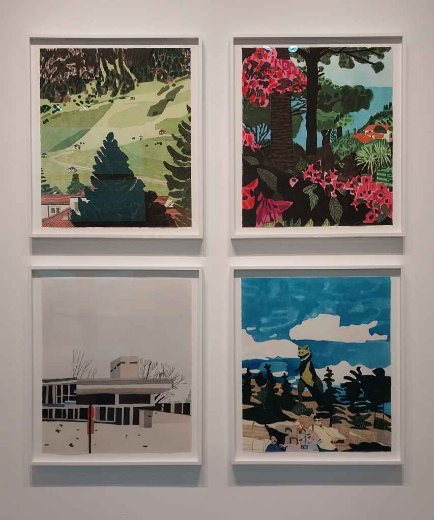 Subtle subversion also sneaks into the scenery in Jonas Wood’s “Four Landscapes,” a quartet of paintings conveying the four seasons, but with the summer episode rendered tense by the presence of a large Tyrannosaurus. Is it real or a jumbo tourist-bait replica? The startled look on a vacationing family’s face leaves us wondering.