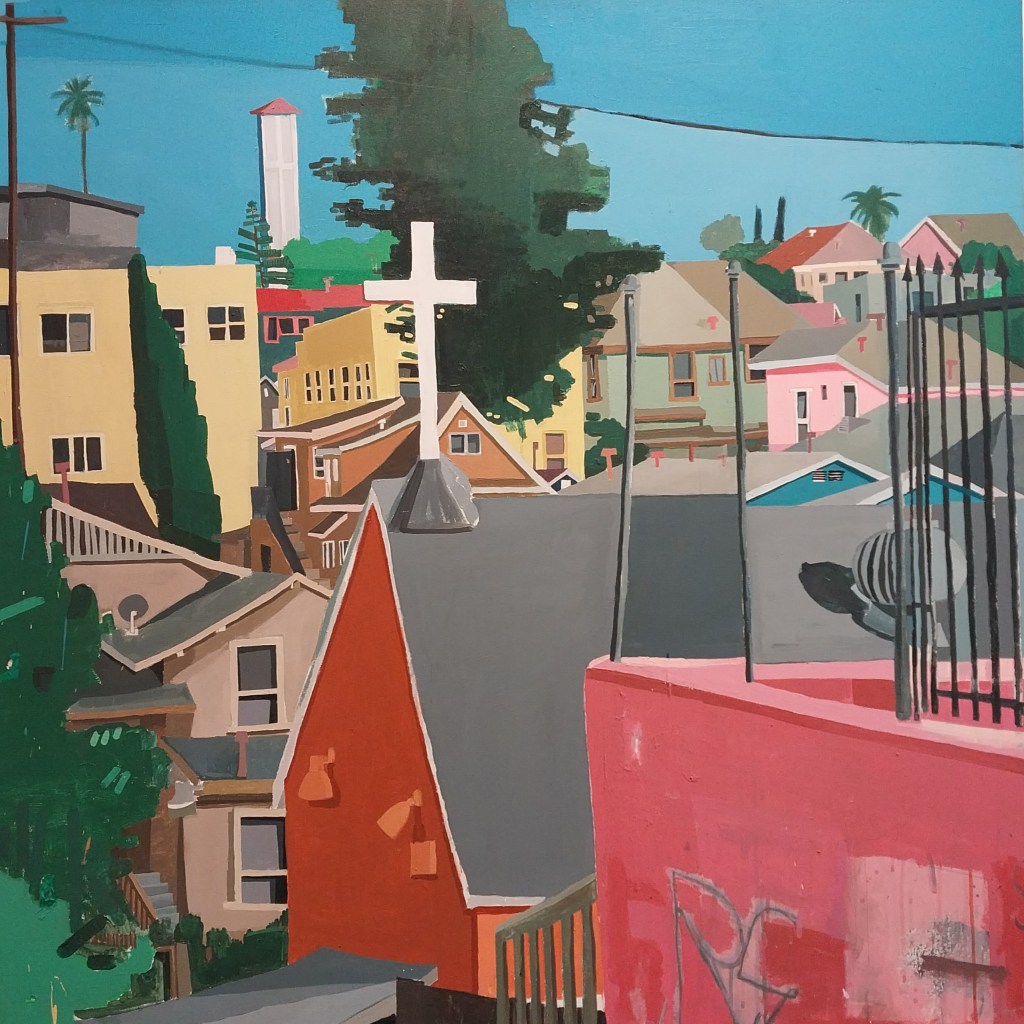 Parallels to the loaded geometries and design instincts of the urbanscapes of artworld icons Charles Sheeler and Edward Hopper take on more contemporary and socio-politically charged dimensions given the painting’s title, with its allusions to immigration angst (via ICE) and religious skepticism. The visually appealing geometric tumble and vivid palette tease the eye, but this is anything but a neutral day-in-the-neighborhood scene.
