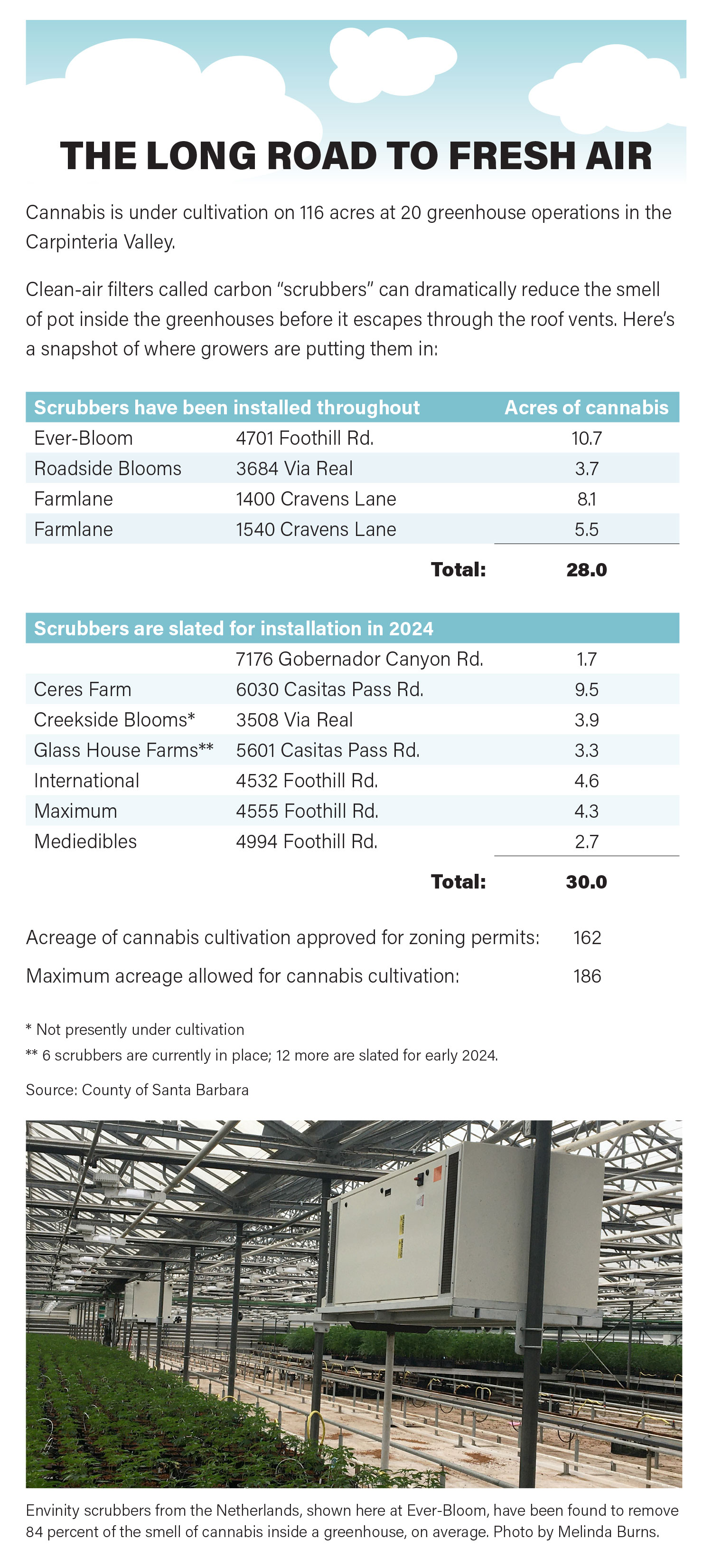Seven greenhouse operations totaling 30 acres are slated for scrubbers next year in the Carpinteria Valley, records show; the growers agreed to install them as a condition of their zoning permits. That means that in all, 58 acres, or half of the cannabis acreage under cultivation in the valley, could be equipped with scrubbers by the end of 2024.