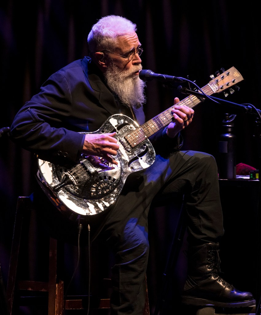 Deep into Bruce Cockburn’s inspiring recent concert at the Lobero, the 78-year-old Canadian folk legend took a little yet arduous trip. He moved over from his center stage post, where he intensely hunched over his guitars with a leg propped high on a suitcase, over to a hammer dulcimer to play “Lovers in a Dangerous Time” — but his diminished physical state requires two canes and a slow-going process. Cockburn joked, “that’s the choreography part of the show.”