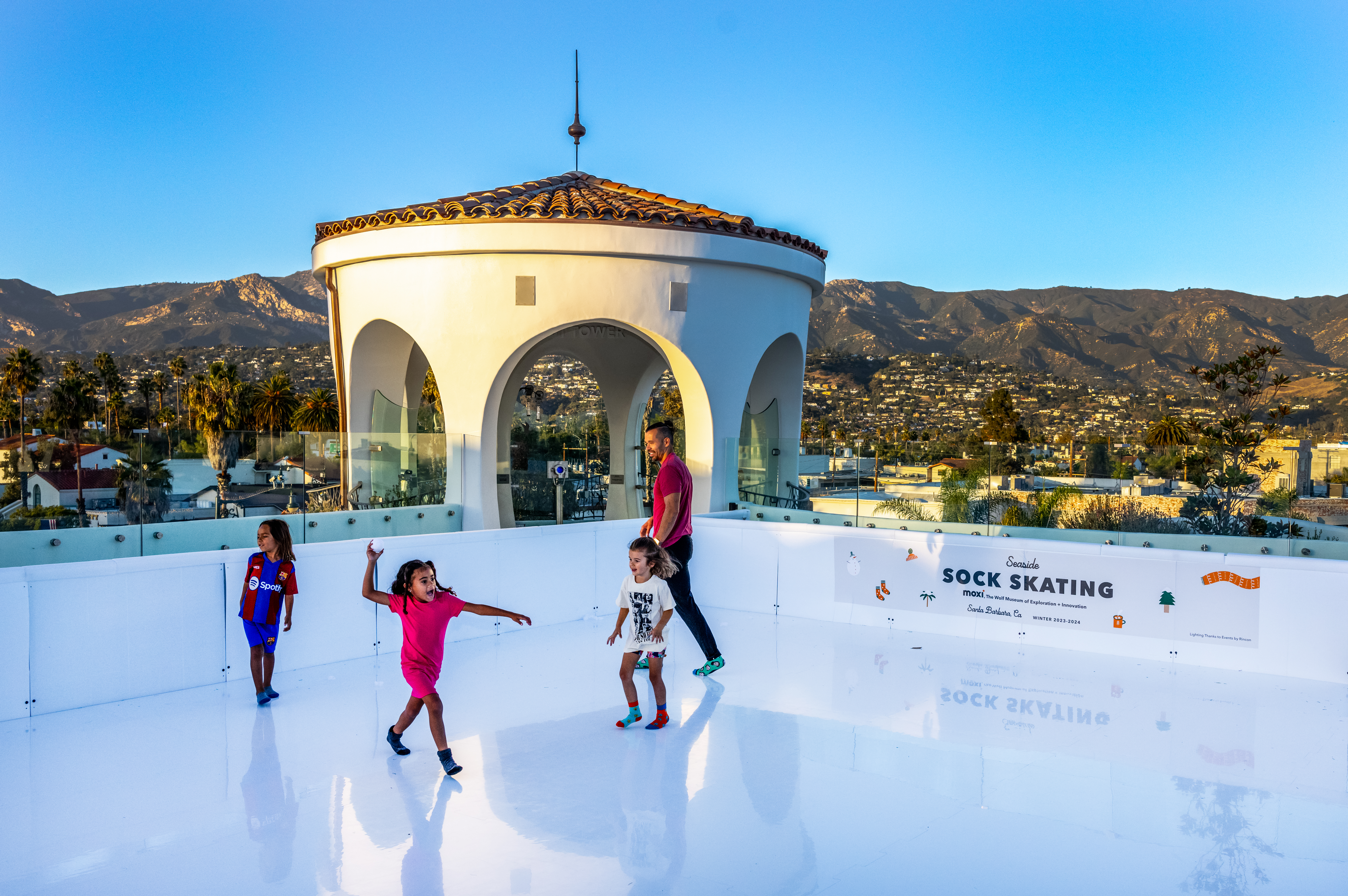 Hot chocolate, Christmas trees, stockings, candy canes, and … sock skating? MOXI, The Wolf Museum of Exploration + Innovation fused together tradition, holiday spirit, and science to create their latest installation: rooftop sock skating.