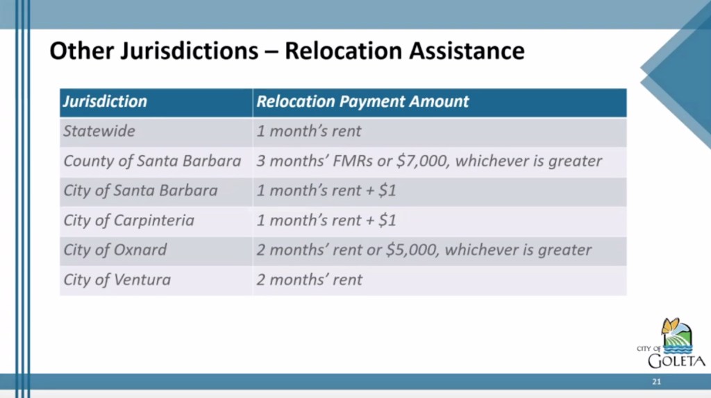 RELOCATION ASSISTANCE: In the case of no-fault just-cause eviction, landlords must help their tenants move. Graham provided a table showing how different jurisdictions have handled the obligation. Goleta chose to adopt two months of rent as the relocation assistance amount.