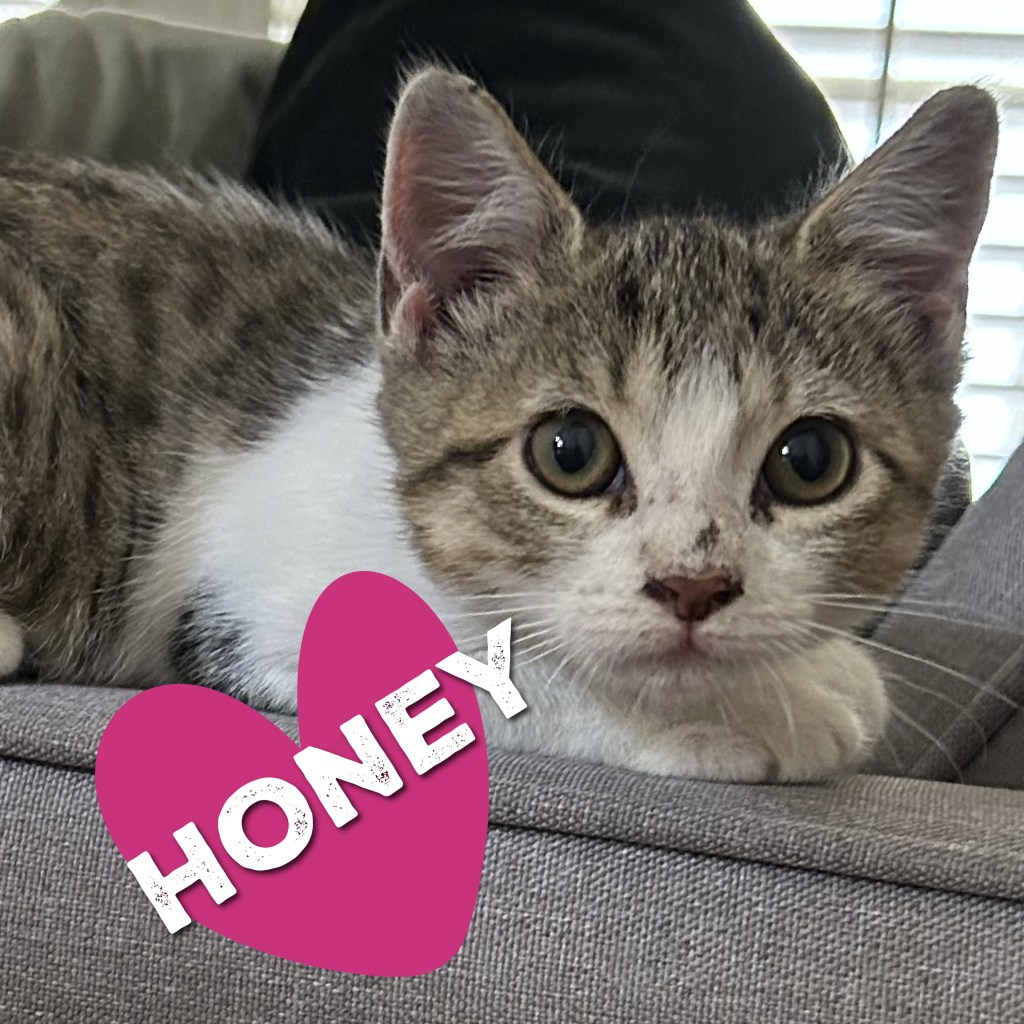 Introducing Honey! With her one-of-a-kind markings and gentle demeanor, Honey is the purr-fect companion for anyone in search of a loving and affectionate feline friend. She absolutely adores being showered with attention and is always ready to curl up on your lap, purring her heart out. As a bottle-fed kitten, this beautiful 6 month old Domestic Short Hair kitten has formed a deep bond with humans, and her trust in people is unwavering. This unique upbringing has shaped her into a loving and sociable companion, always eager to be by your side.