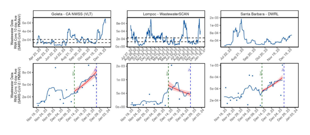 In Santa Barbara County, wastewater results are available from facilities in Goleta, Lompoc, and City of Santa Barbara, tests that revealed an increasing trend in virus detection in Goleta and Santa Barbara between Thanksgiving and Christmas, a trend that declined in Lompoc. The last reported hospital information from the state Department of Public Health is dated November 4, 2023: 10 people were hospitalized with COVID, three more than the week before. A total of 831 people have died of the virus since the pandemic first hit Santa Barbara in March 2020, an increase of 17 since our last report in September.