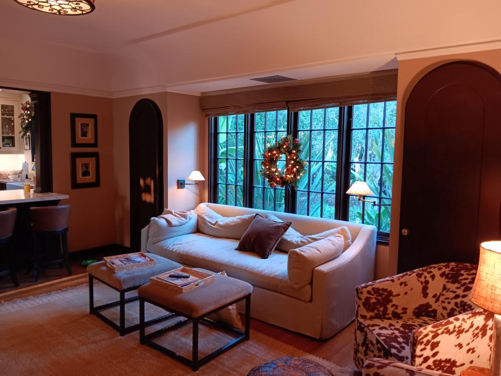 This Mediterranean-style home has an Old-World feel and features graceful arches inside and out. It is nestled into the hillside and looks out over the city that Adrian helped rebuild after the earthquake.