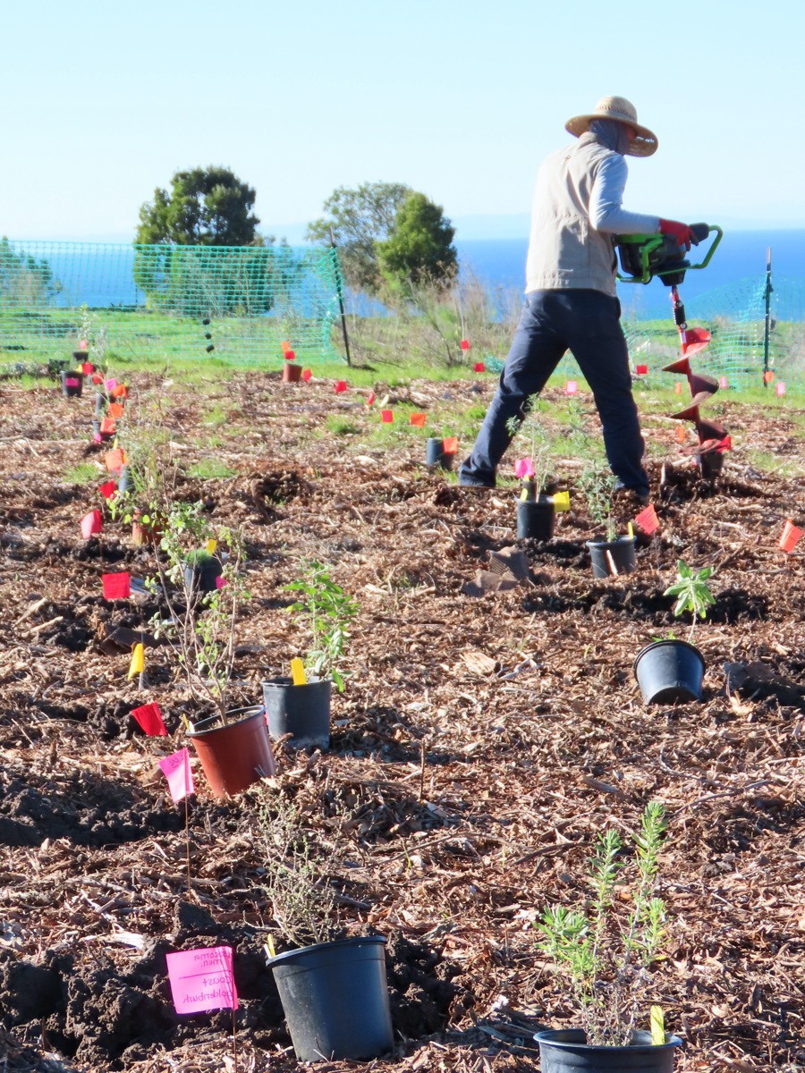 People and their dogs passed by with curious glances as augers whirred and color-coded markers flapped in the wind. Santa Barbara retiree Bob Crocco was planting white sage in one section of the field, which had been covered by a black tarp to basically bake and kill the invasives.