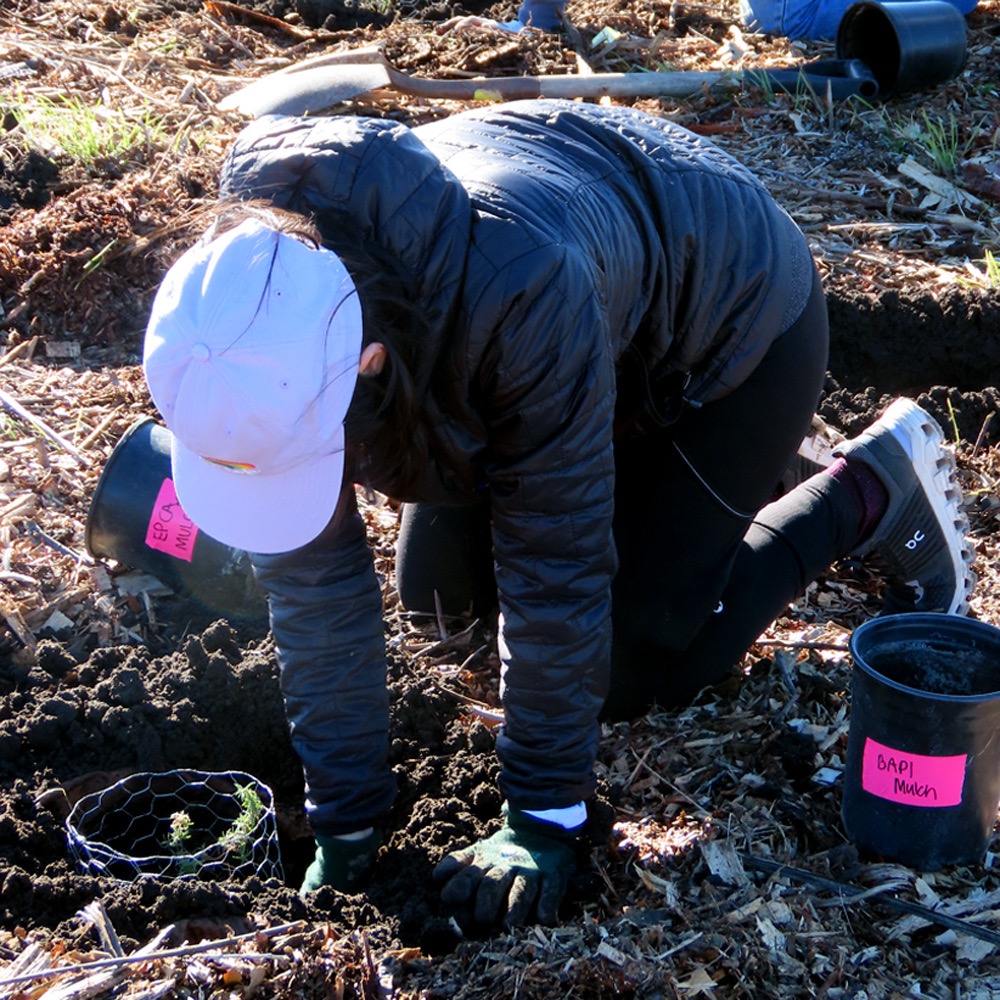 On the morning of Sunday, January 7, volunteers crowded the field, which was full of holes and primed for the next step: planting California natives. Recent rains played a helpful role in softening the soil to get it ready for its new inhabitants.