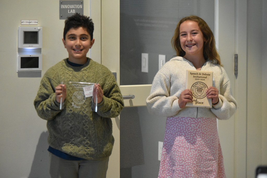 Dunn School Senior Alex Grenier earned first place in a field of 14 students in the Spontaneous Argumentation (SPAR) competition on Friday, and Dunn School Freshman Husna Balaven scored a first-place finish with the best high school interpretive speech on Saturday.