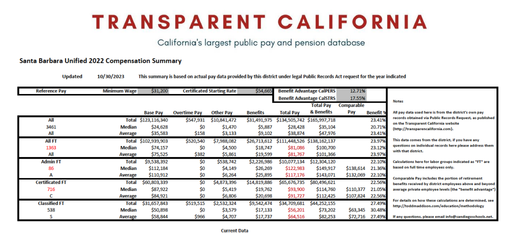 To look at actual teacher pay the best data source is SBUSD’s own payroll records. Fortunately we have those, obtained using a legal Public Records Act request and published on the Transparent California website.
