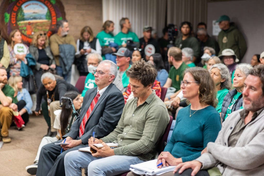 It was a sea of green at Carpinteria City Hall Thursday night, as hundreds packed into council chambers, and twice as many lined the walls, sat on the floor, and peeked through windows, waiting their turn to voice their opposition to a proposed 99-room “farmhouse resort” on the coastal bluffs. Outside, several generations’ worth of Carpinterians huddled together around a TV, erupting into cheers that echoed inside the hall whenever another citizen spoke.