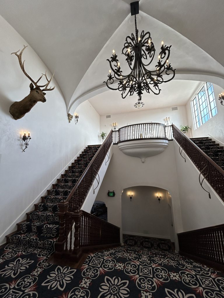 The Spanish Colonial Revival structure and its adjacent building — constructed where a parking lot once was — are home to 32 rooms and suites. Nineteen of the guest rooms are in the original historic building, featuring striking architectural details such as high ceilings with painted wood beams and original chandeliers. Part of the restoration process was uncovering original elements, such as the balcony doors overlooking the lobby from the second level. They also repurposed as many original features as possible, including vintage red velvet theater chairs placed in the rooms and Elks Lodge memorabilia adorning the walls. Other antique elements were hand-picked from personal and family collections.