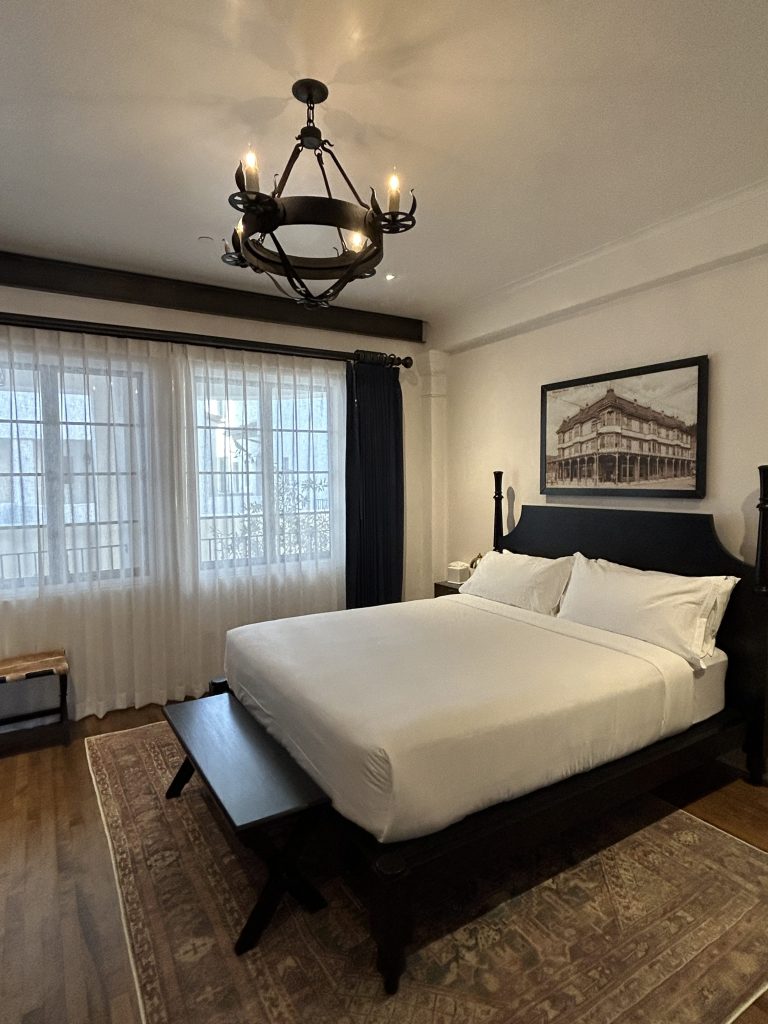 During their third week of business, I gleefully checked into the very spacious room 111, situated on the corner of Ash and Main streets on the ground level. Large windows on three sides let beautiful light stream in at all times of day. The open floor plan featured a glass-enclosed tiled shower (something to consider if planning to share such a room) and sink nook in one corner. The toilet is discreetly tucked behind a barn door, while the large dark wood bureau holds a minibar stocked with complimentary water and snacks. You also get a choice of a bottle of Ojai Vineyard wine or four-pack of Transmission Brewery beer upon check-in — on the house.