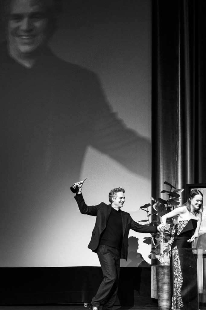 That humane core that comes through in Ruffalo’s performances again and again, also came through with his acceptance speech. Not only was he incredibly gracious talking about his family, his professional team, and working with Stone as well as the excellent interviewer Thompson, he also used his platform to acknowledge that we were on the ancestral lands of the Chumash — “20,000 native American people once lived here and I want to thank them for hosting us in spirit tonight” — and “to talk about the 1.9 million people on the people on the border of Egypt and why it’s happening is equally horrible for the people of Israel.”