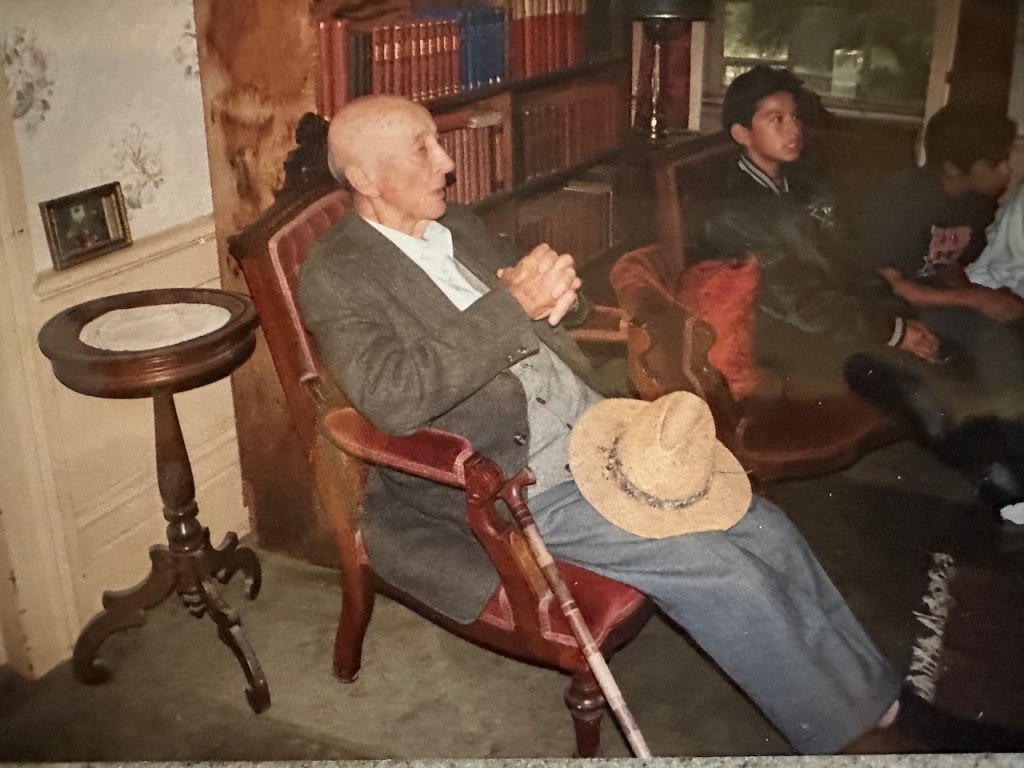 November’s slightly breathless light drenched the hills and fields as we drove along Highway 1 towards Lompoc. The 6th grade students of Vista de las Cruces School were about to meet and interview Dibblee “Dibbs” Poett (1907-2000) of Rancho San Julian. One of the few Spanish land-grant ranches still owned by its founding family, the ranch is located just up the road from Las Cruces, where the Santa Ynez Mountains become the Santa Rosa Hills. We turned off Highway 1, rattled along a dirt road, and parked in front of the casa. Dibbs pulled up in an old Mercedes, his dog by his side. He looked dapper in a straw hat, tweed coat, and gray flannel trousers. Walking carefully with a cane, he led us into the house.