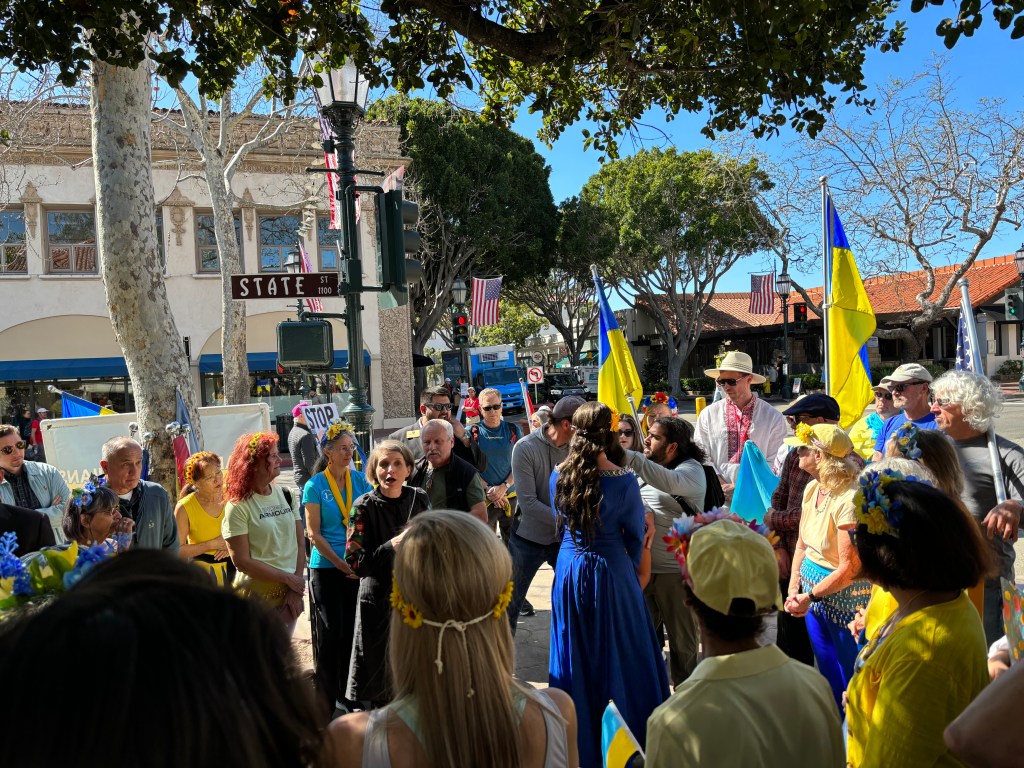 The war in Ukraine was on most everyone’s mind as dozens of people gathered at Speaker’s Corner in downtown Santa Barbara dressed in blue and yellow, wearing sunflowers, and carrying flags of many nations. A bake sale offered sandwiches, breads, and drinks, part of the fundraising ongoing by the group Ukrainian Women of Santa Barbara. But as the rally got underway on Saturday morning, the second anniversary of Russia’s invasion of Ukraine, the speakers were persistently interrupted by a man yelling for a cease-fire.