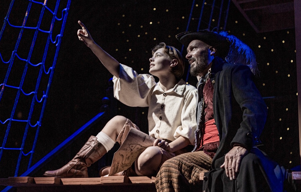 Treasure Island includes plenty of the swashbuckling intrigue we love about European buccaneers: mutiny, blade fights, buried treasure, and the chatty parrot on the captain’s shoulder. The noteworthy change in this adaptation (by Bryony Lavery) is that young Jim Hawkins, the scrappy hero in the center of the pirate business, is written as female. Played by Emiliana Jasper, Jim Hawkins’s indomitable will and stirring enthusiasm pushes the pace of this production, which trots playfully in the first act but trudges in the second, dragging under the weight of lifeless comedic bits pushed to their breaking point.
