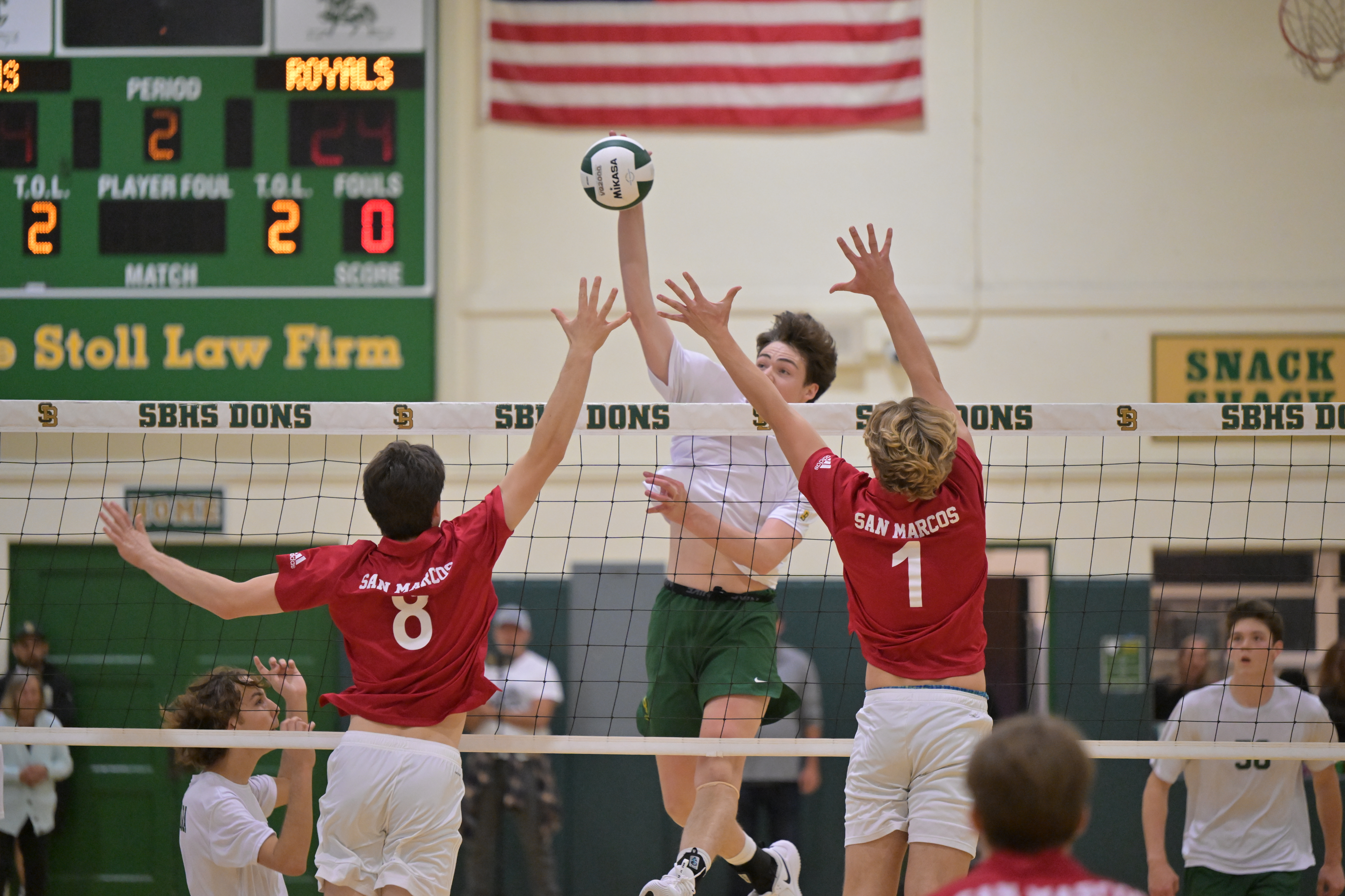 In set two, San Marcos jumped out to a 10-3 lead on a block by Declan McClintock. However, Santa Barbara methodically worked its way back into the set and tied the score at 14-14 on a solo block by Denver.