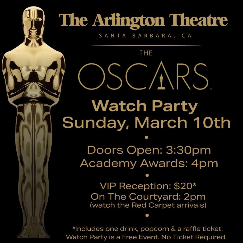 Looking for a big screen to watch the Academy Awards broadcast on March 10? The Arlington Theatre is hosting a FREE watch party as well as a special pre-show ticketed event, where $20 gets you a red carpet pre-show party, priority seating for the big event, free popcorn, a free cocktail, and a raffle ticket for a chance to win prizes. Tickets are available at the Arlington Theatre box office. See ArlingtonTheatreSB.com for more info.