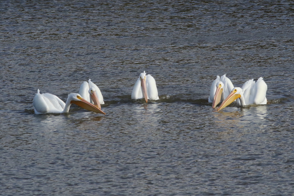 Later in the afternoon, I returned with the incoming tide, observing the white pelicans moving across the deepening channel in a blend of synchronized foraging. Effortlessly, they glided across the silty waters, swimming next to each other in a tight formation, either in a line or half-circle. Then, simultaneously, they dipped their beaks into the water to fill their ginormous pouches with fish.