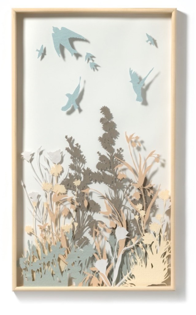 At the heart of “Arriving Home” are Freel’s distinctive multilayered paper silhouettes. She begins by embossing the paper to infuse it with textured patterns. Then, with precision, she hand-cuts and layers these papers into the intricate forms of native plants and birds. The resulting artworks might be easily recognized as birds and plants from afar, yet it’s the closeness that reveals the magic: the embossing creates subtle shadows and textures, not immediately apparent, which breathe life into each piece. This meticulous detail invites viewers to lean in, drawing them into a world where every silhouette seems to flutter or sway with the unseen currents of the air.